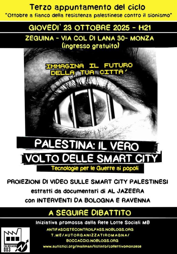 Lottare contro la smart city e le tecnologie ad essa connesse significa combattere contro il genocidio, contro il sionismo oltre che contro il tentativo totalitario e sempre più reale di controllo totale sulle nostre vite e sulle nostre città sempre più simili a prigioni invisibili e digitali.