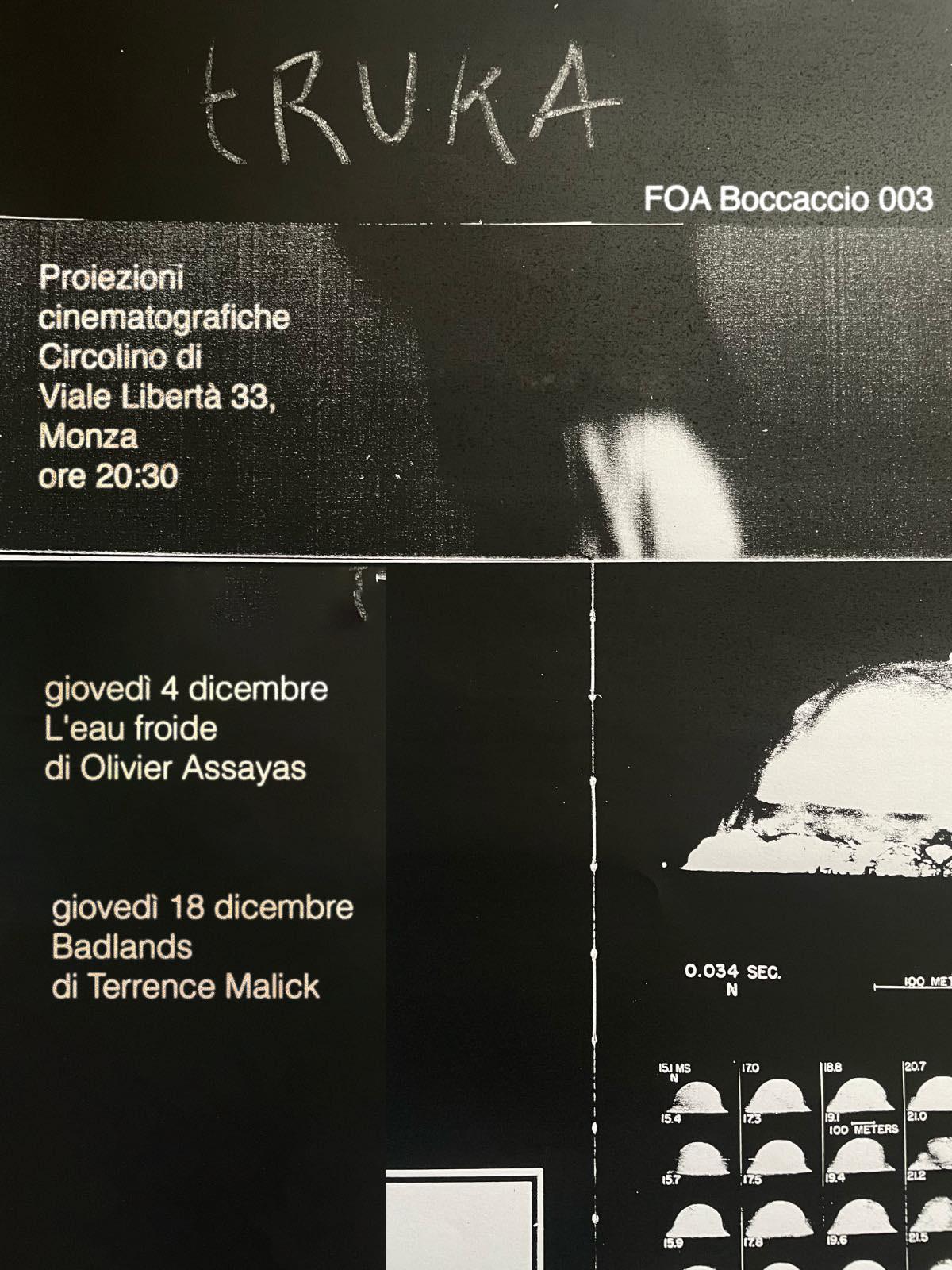 Ritorna il cinema a Monza con TRUKA, il nuovo progetto cinematografico della F.O.A. Boccaccio. In una città sempre più povera di iniziative culturali, sentiamo la necessità di creare spazi in cui l’aggregazione possa svilupparsi in modo libero e gratuito. Il cinema è un luogo in cui stringere legami, far circolare idee e riflessioni, incontrare nuove persone e punti di vista o, semplicemente, guardare un bel film.